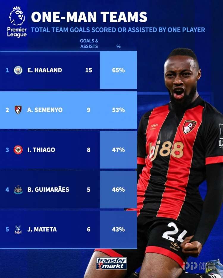 责任编辑: 体育24小时热点德国转会市场统计了球员本赛季英超参与进球数量占据球队总进球的比例,并列出榜单,哈兰德占比65%最高,塞梅尼奥占比53%第二。