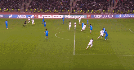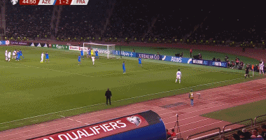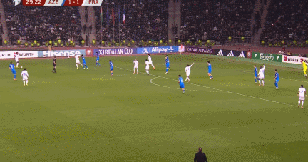 第45分钟,阿塞拜疆门将马哈马达利耶夫乱战自摆乌龙,法国3-1!