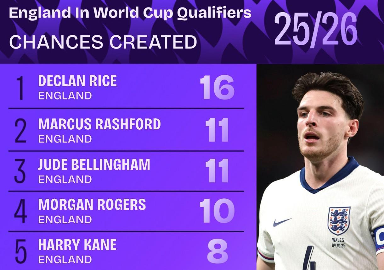 根据Squawka的统计,在本届世预赛欧洲区的比赛中,赖斯一共为英格兰队创造了16次机会,这一数据排在队内所有球员的第一位,比排名并列第二的拉什福德和贝林厄姆多出了5次。